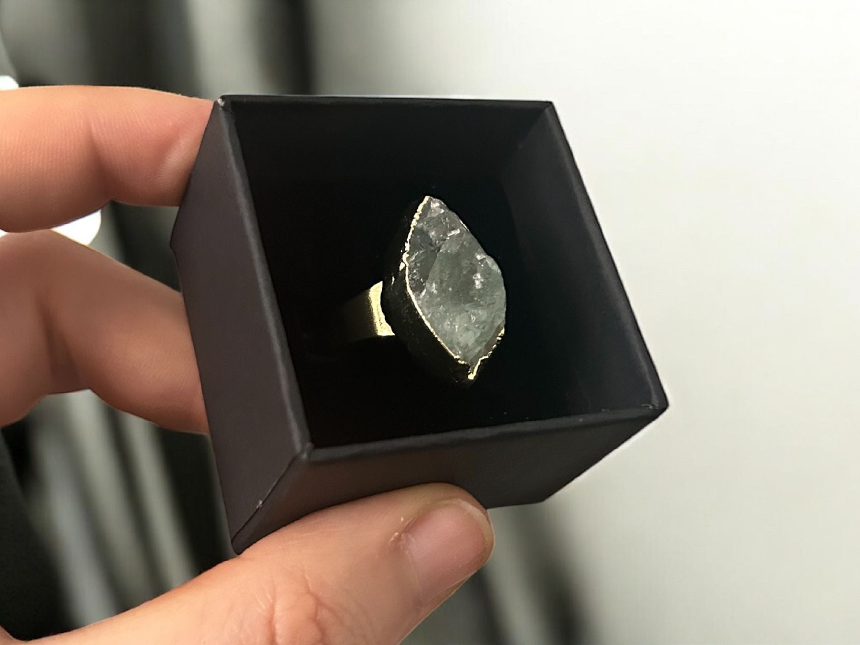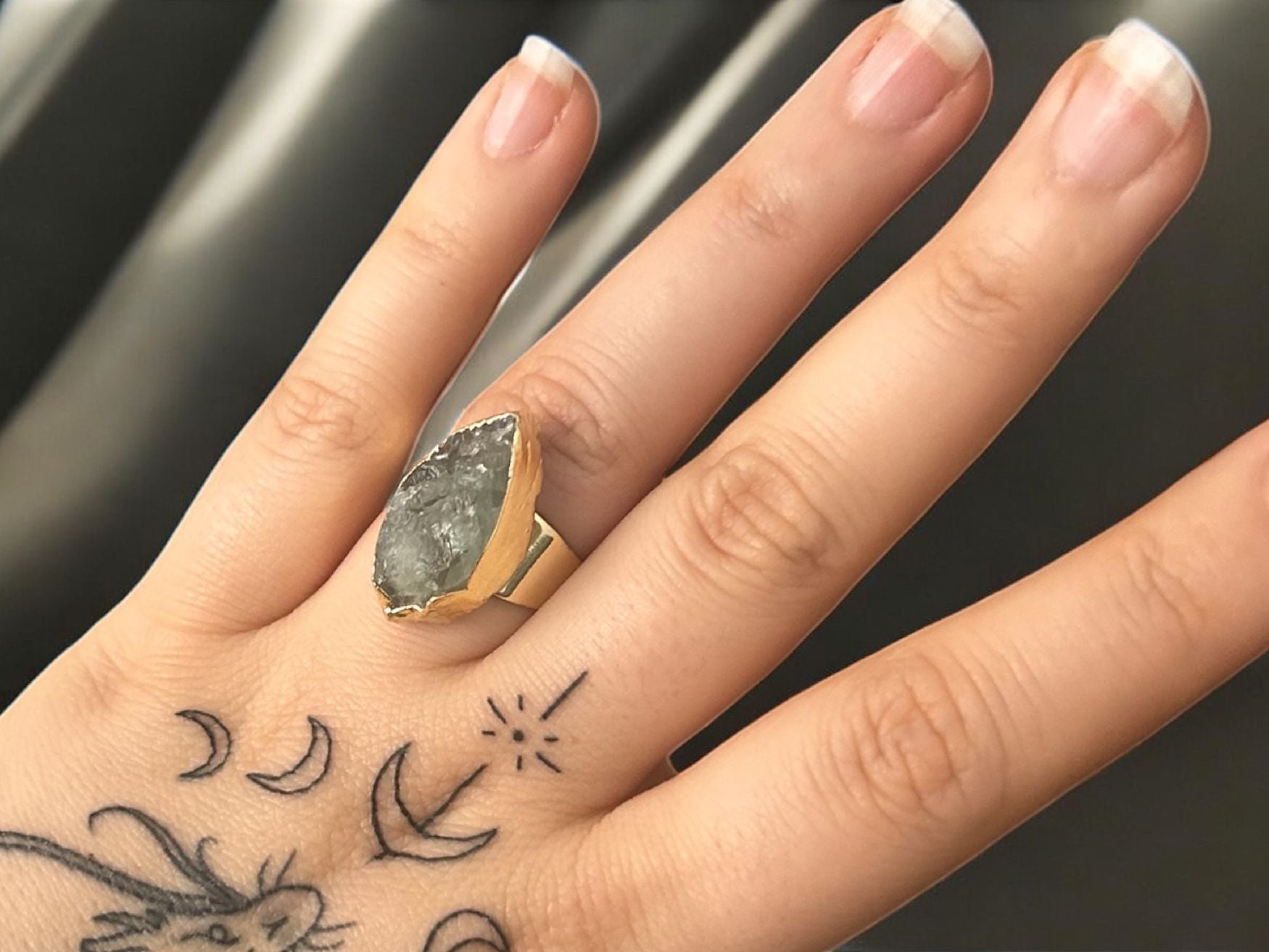This gold band ring made of hypoallergenic, rhodonite-plated copper is adjustable in size and an elegant eye-catcher.