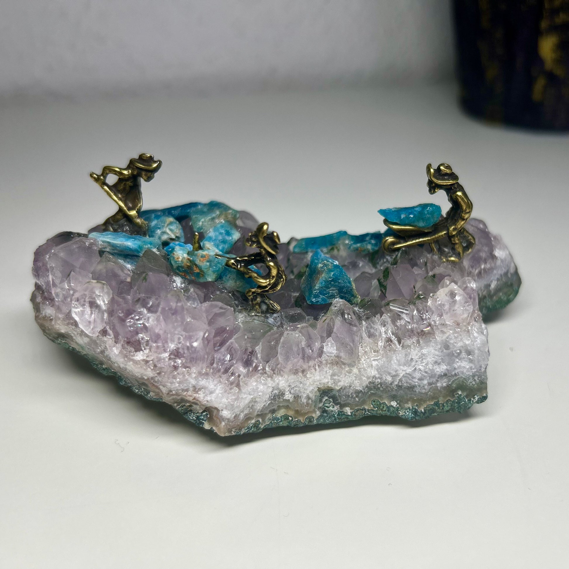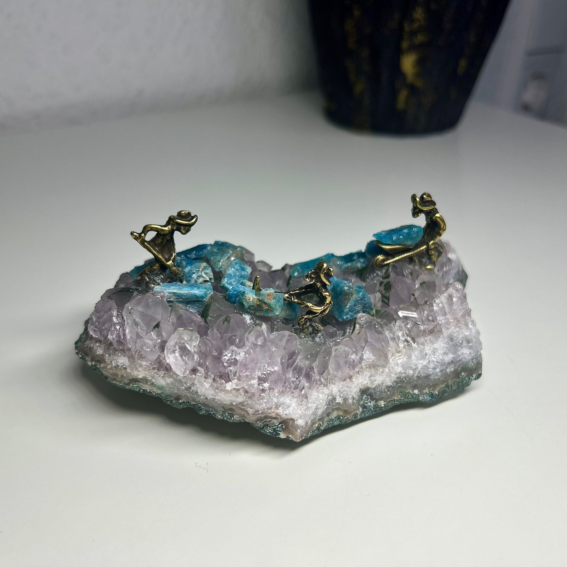Dieses besondere Kunstobjekt erzählt die Geschichte von Entdeckergeist und innerer Schöpfungskraft: Auf einer kraftvoll violetten Amethyst-Druse arbeiten drei kleine Minenarbeiter aus massivem Kupfer, umgeben von türkisblauen Apatit-Rohsteinen. Die filigranen Figuren stehen sinnbildlich für Durchhaltevermögen und Hingabe – jeder Funke Kreativität und Mut in uns wird sichtbar.