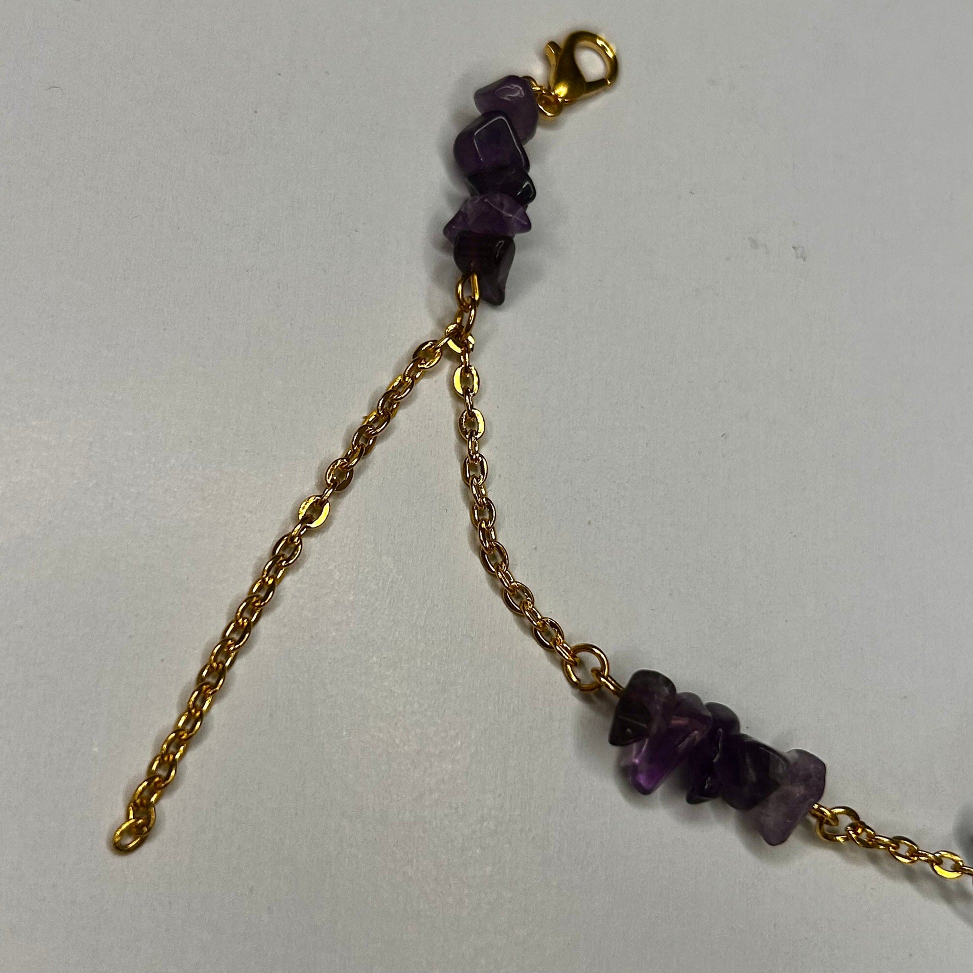 Dieses Armband kombiniert Amethystsplitter in natürlicher, unregelmäßiger Form mit einer feinen, geführten goldfarbenen Kette. Das Design wirkt bewusst unperfekt – wie gemacht für Menschen, die nicht glänzen wollen, sondern strahlen.