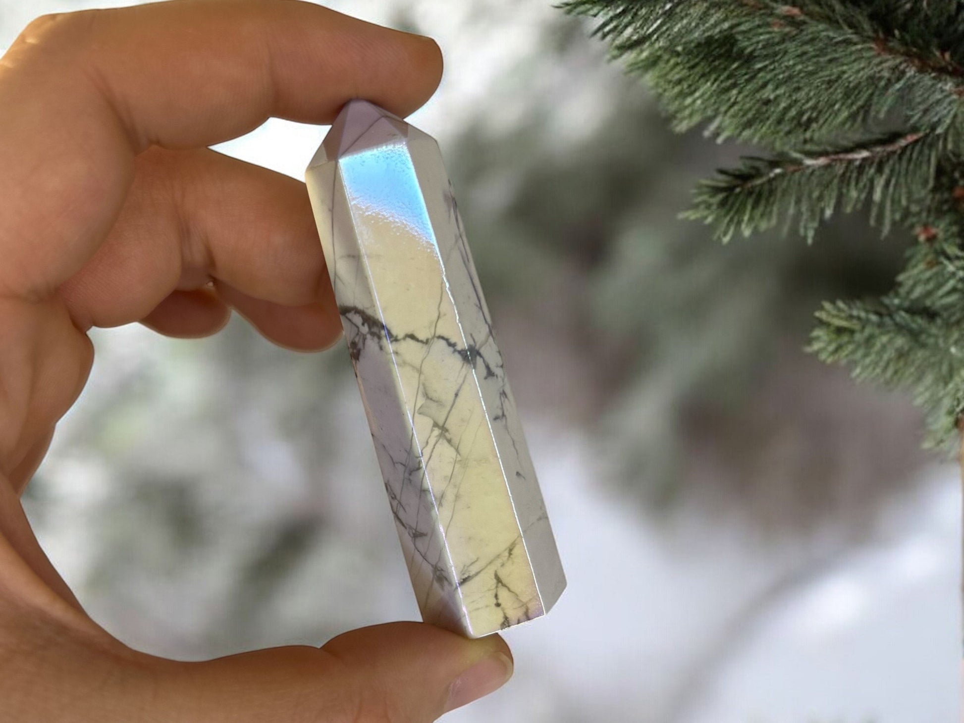Erlebe die kraftvolle Energie dieses außergewöhnlichen Howlith-Turms, der mit einer schimmernden Aura-Beschichtung versehen ist.