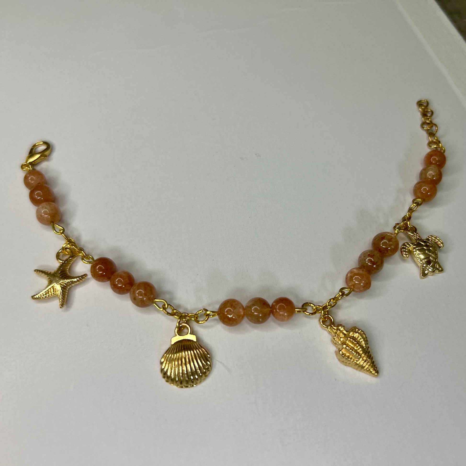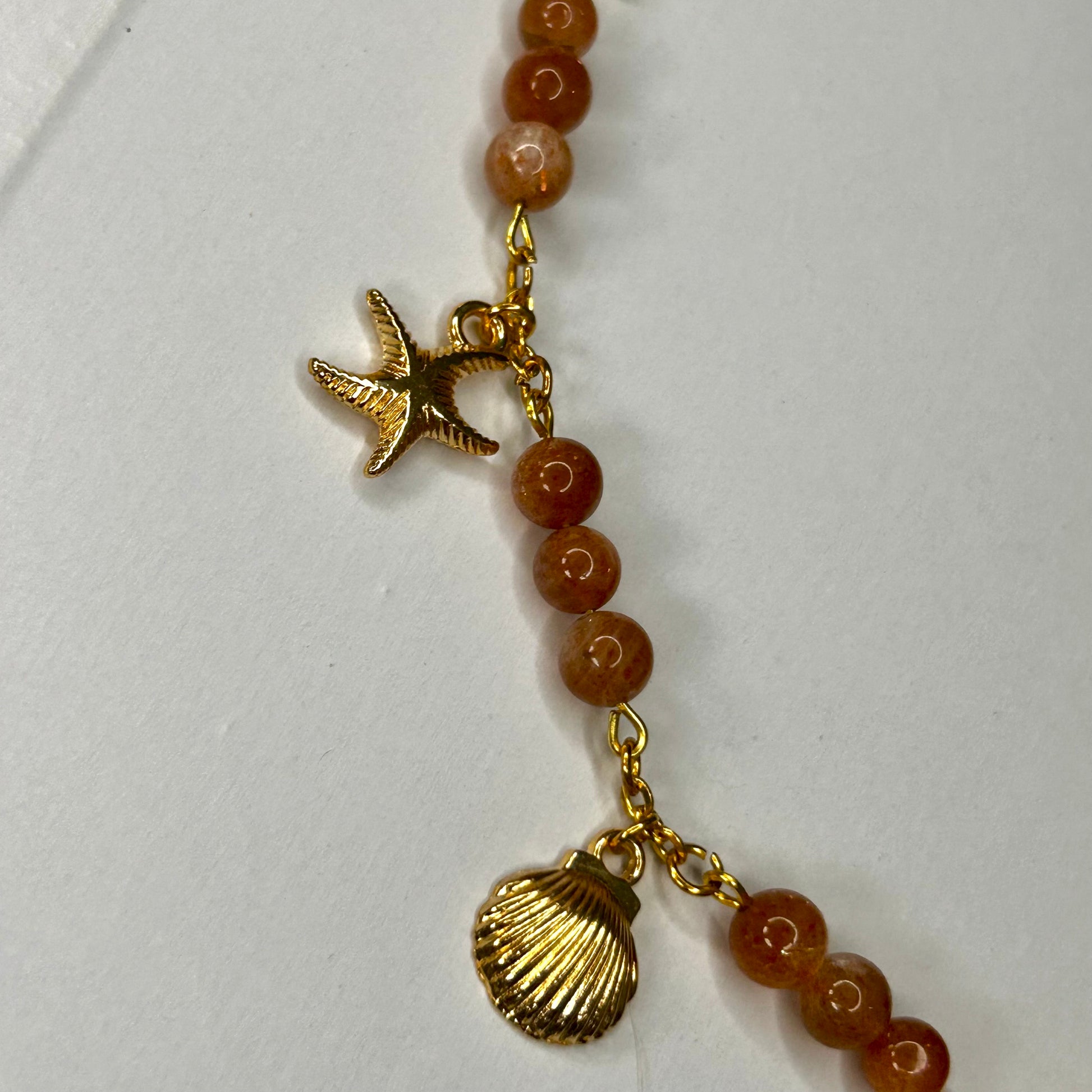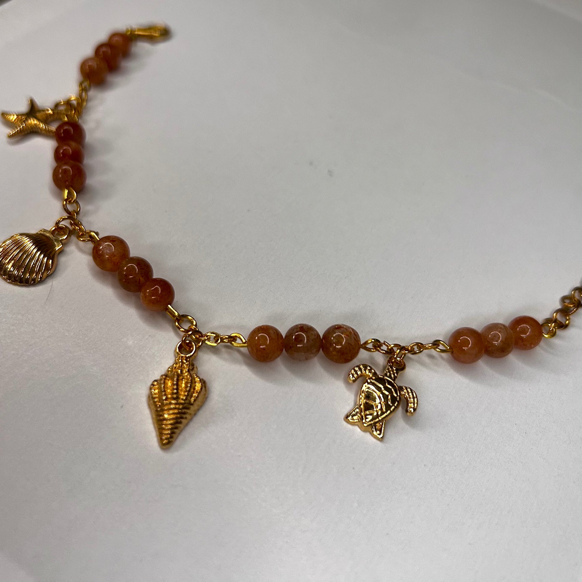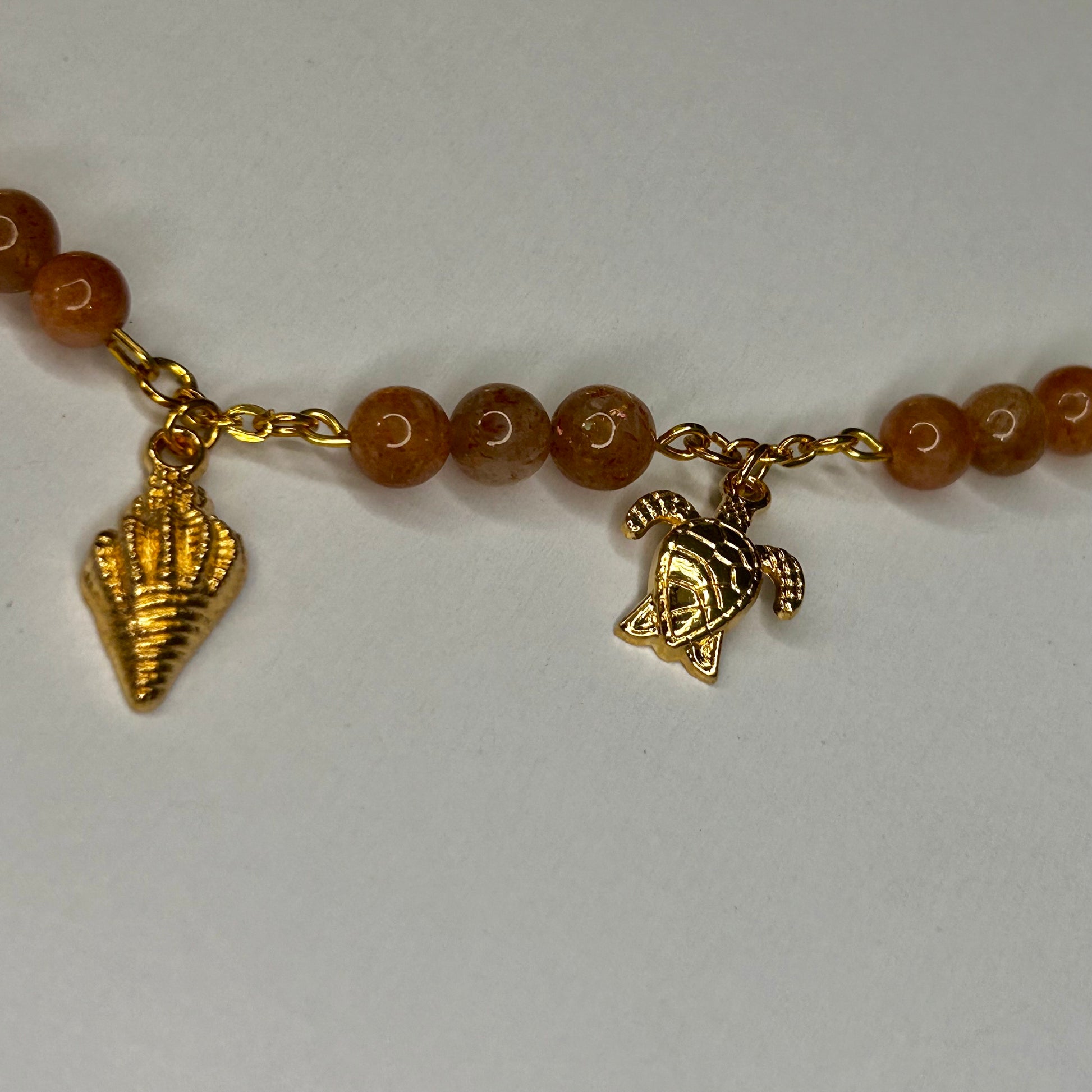 Dieses sonnige Schmuckstück besteht aus glatten Sonnenstein-Perlen, die in ihrem warmen Orange glitzern wie der erste Sonnenstrahl auf dem Ozean. Ergänzt wird es durch vier filigrane Meeresanhänger in Gold: ein Seestern, eine Muschel, eine Schnecke und eine Meeresschildkröte – kleine Symbole für Urvertrauen, Zyklen und Freiheit.