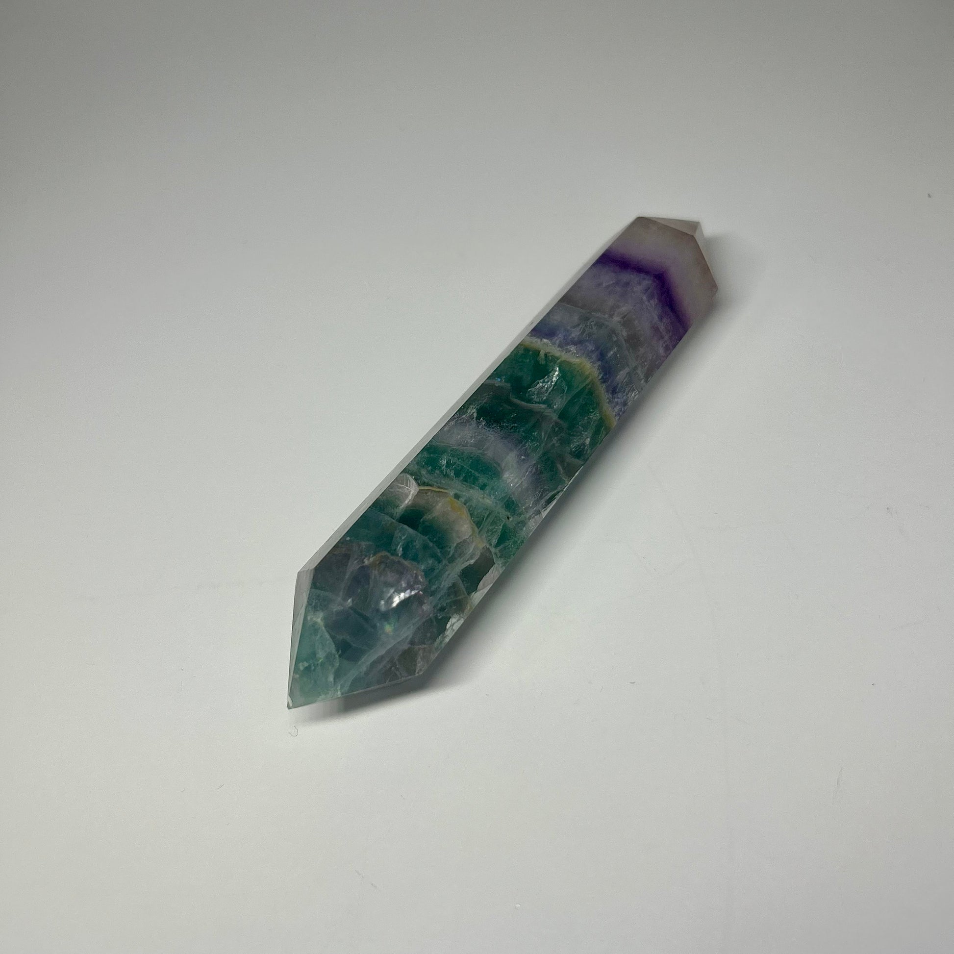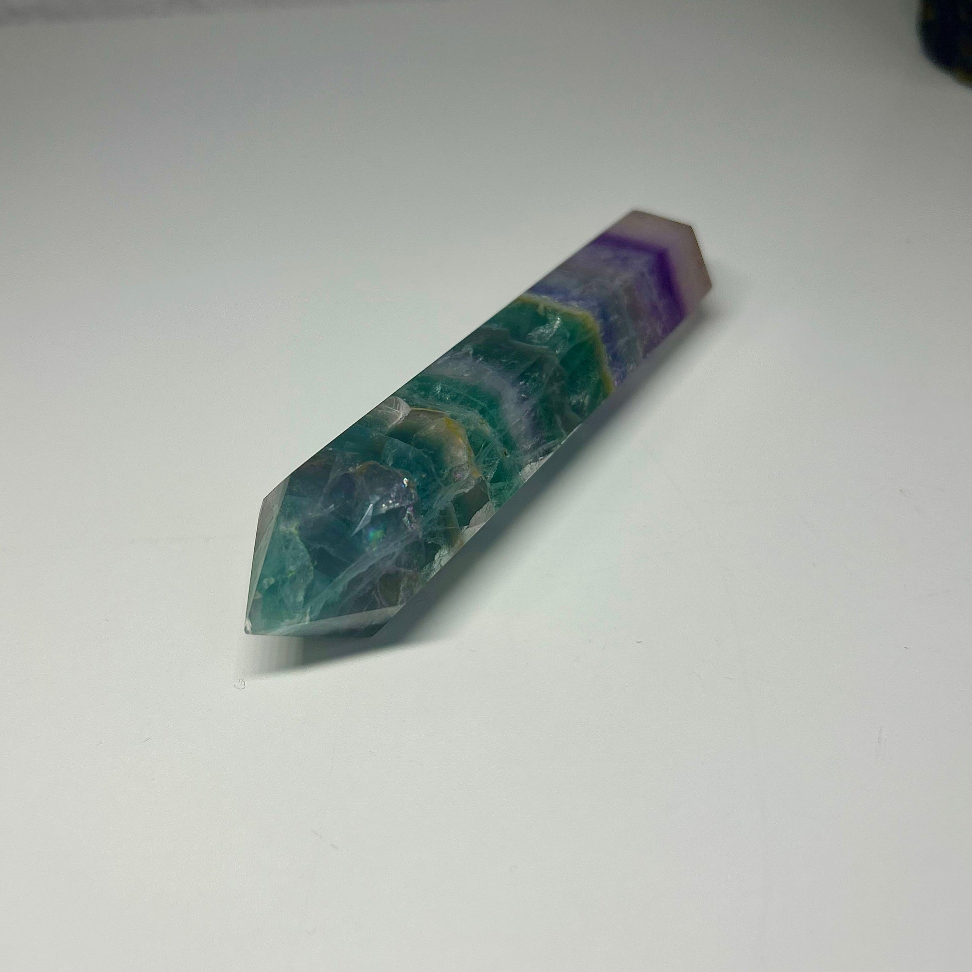 Der Fluorit-Doppelender ist ein faszinierendes Meisterwerk der Natur – violett, grün, zart gestreift und von natürlicher Reinheit. Mit seinen zwei Spitzen leitet er Energie in beide Richtungen und schafft einen kraftvollen Fluss von Klarheit, Konzentration und Balance.