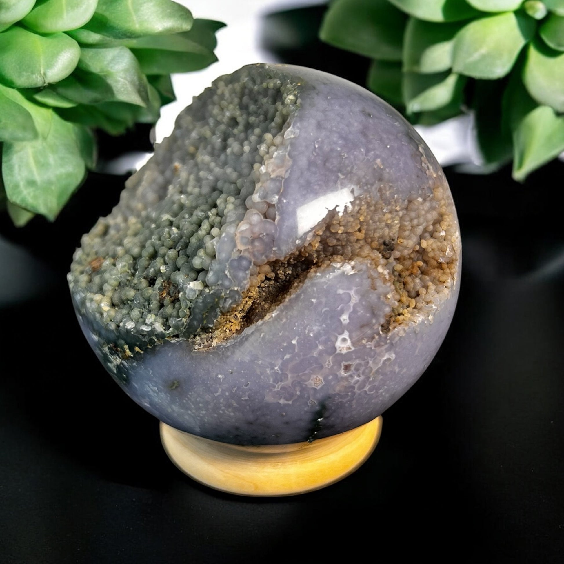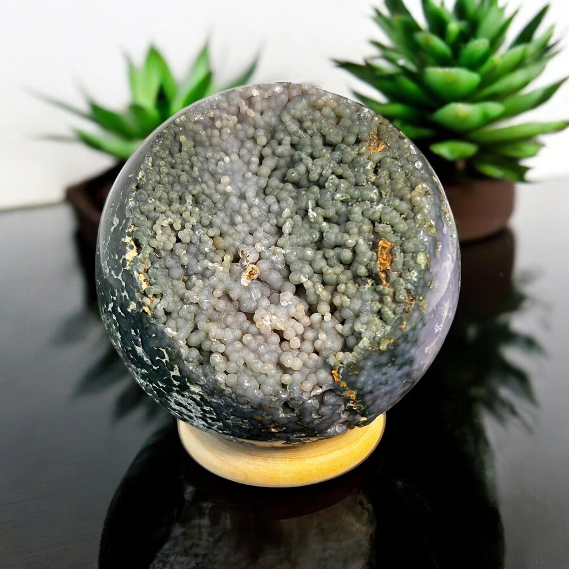 Traubenachat, auch Grape Agate genannt, fasziniert durch seine traubenförmigen Kristallstrukturen und den sanften violetten Schimmer. In Kugelform mit etwa 6 cm Durchmesser zeigt er sich als vollkommenes Symbol der Einheit und Vollkommenheit.