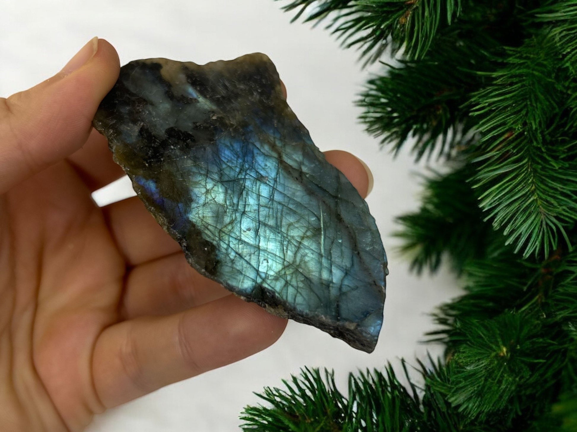Dieser faszinierende Labradorit-Slap stammt aus den mineralreichen Vorkommen Madagaskars und besticht durch seine einzigartige Schönheit und kraftvolle energetische Ausstrahlung. Der Labradorit, bekannt für seine lebendigen Farben und den spektakulären Schimmer, offenbart sich in diesem Slap in seinen vollen Glanz. Bei unterschiedlichen Lichtverhältnissen zeigt der Stein seine charakteristischen irisierten Farben – von blauen bis goldenen Tönen – und entfaltet eine beeindruckende Tiefe und Intensität.
