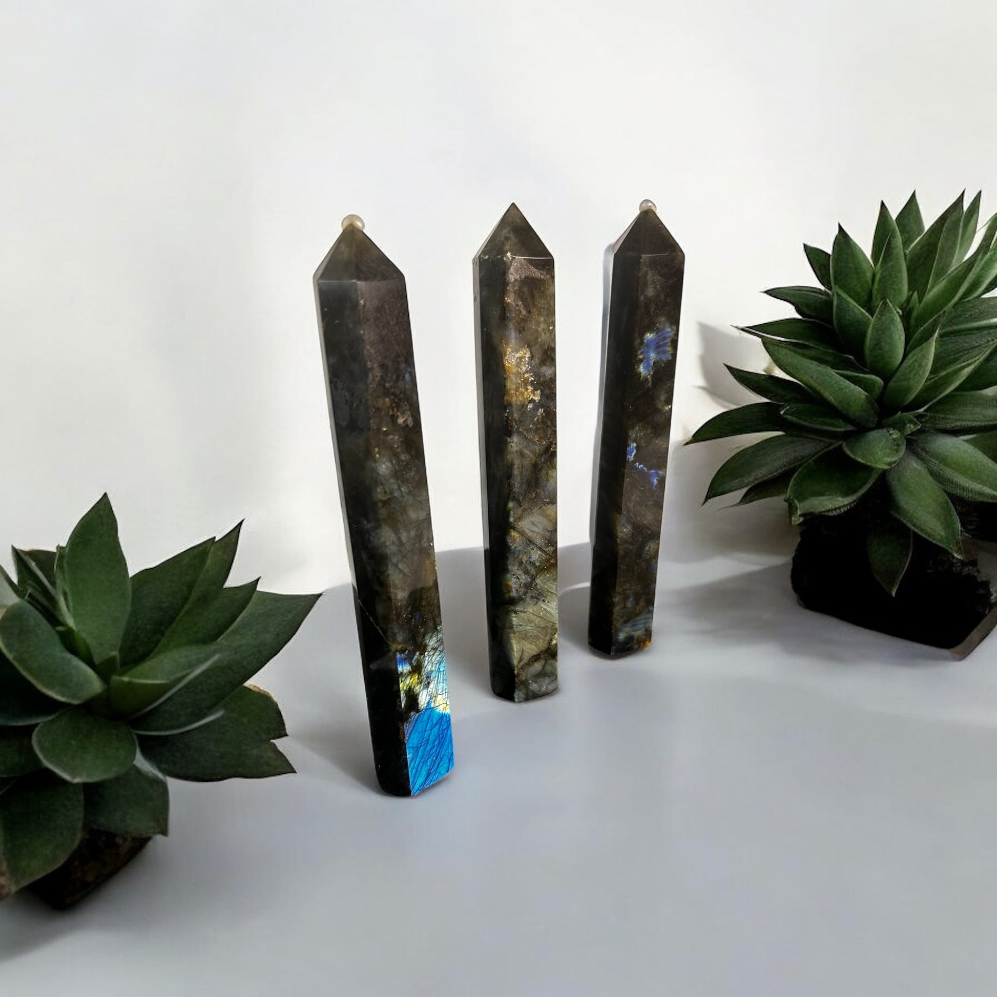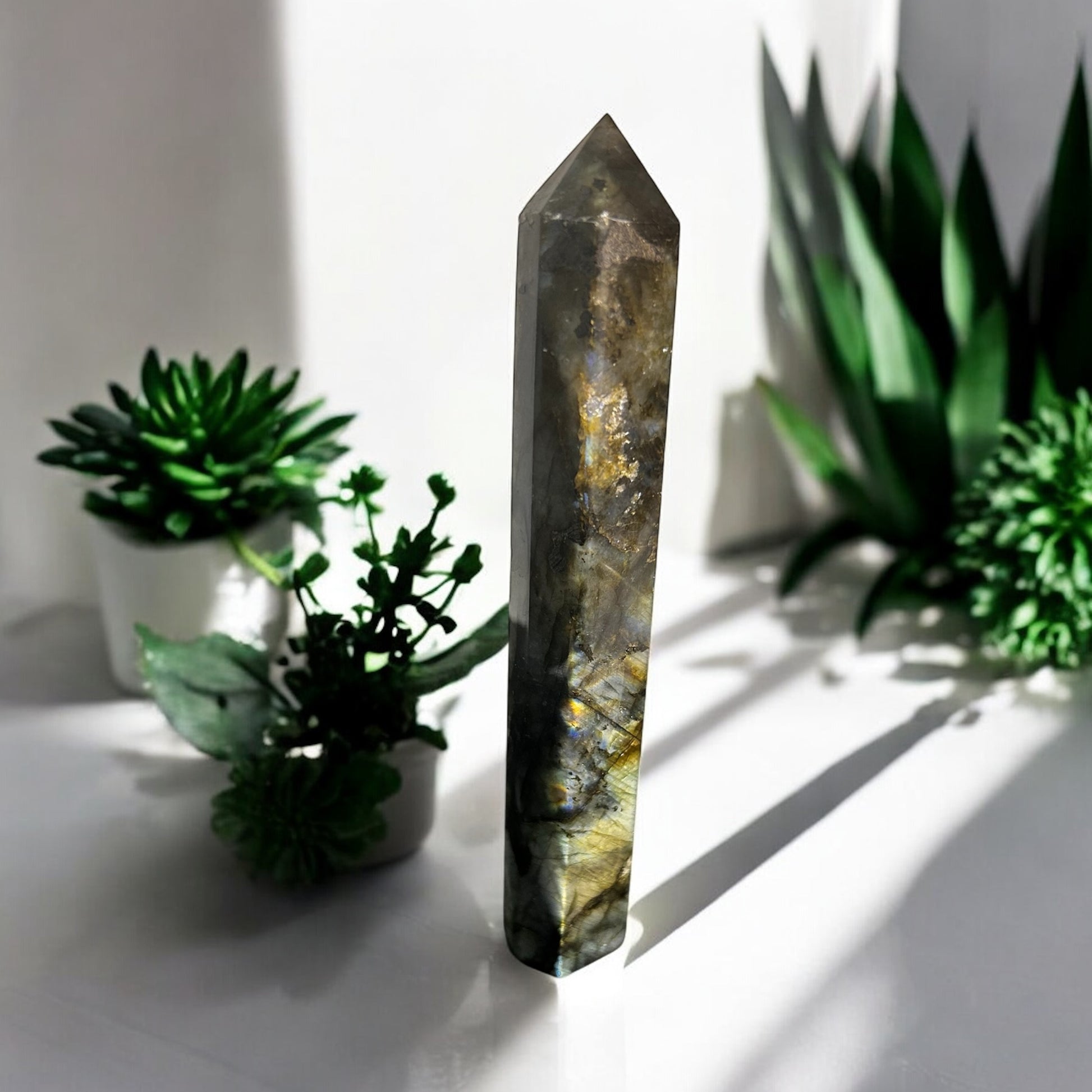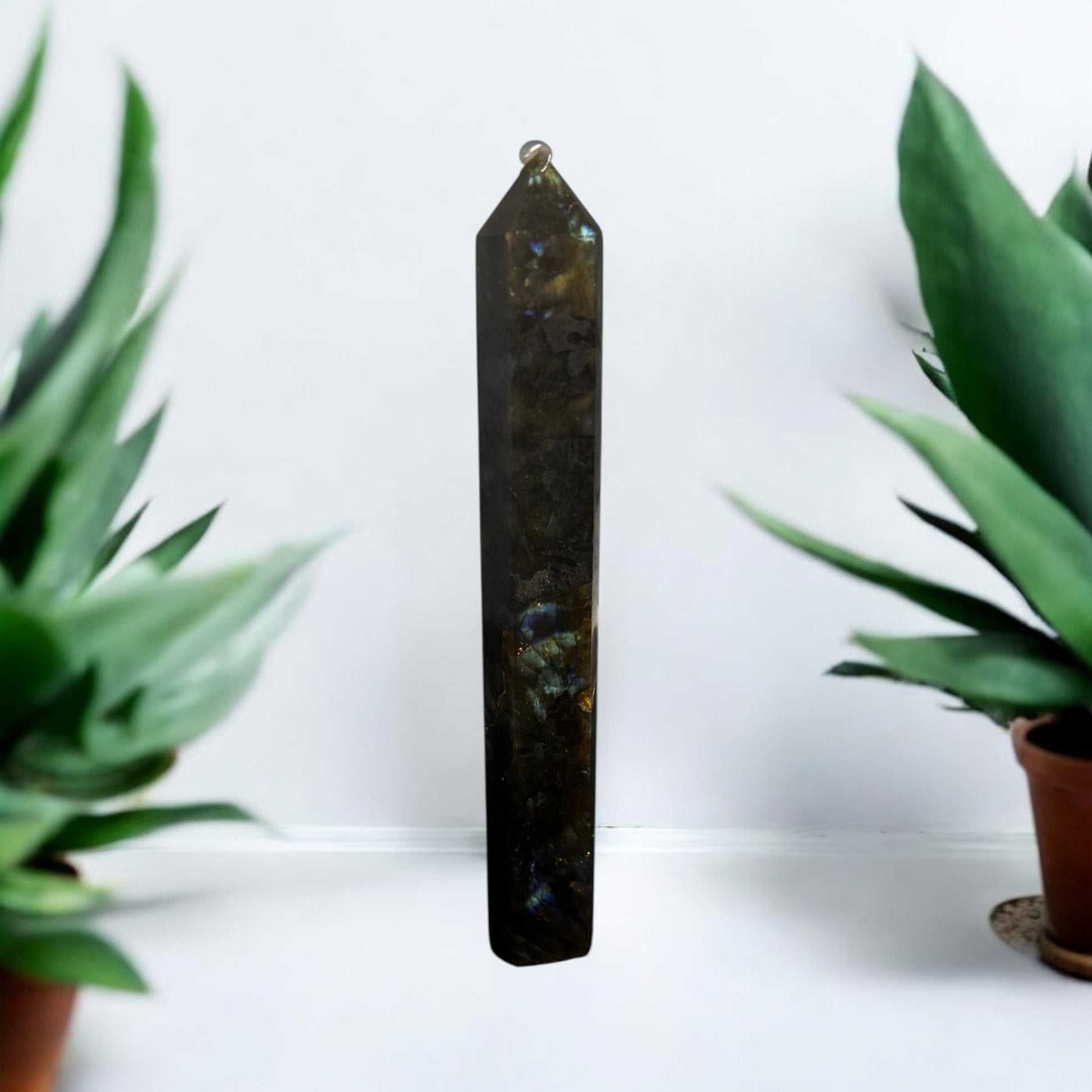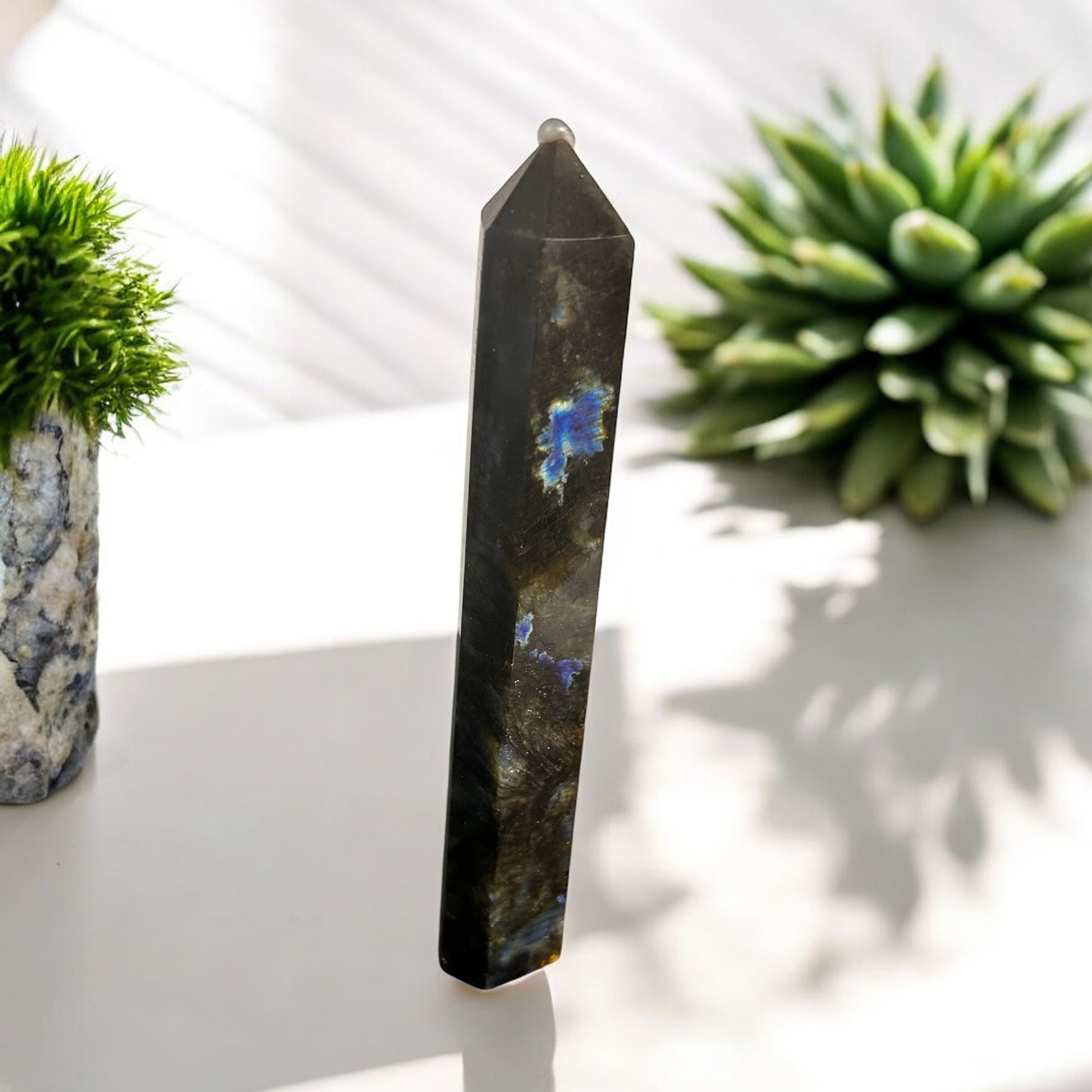 Diese etwa 16 cm großen Türme aus Madagaskar zeigen ein faszinierendes Farbspiel: Tiefgraue Grundtöne, durchzogen von schimmernden Flächen in Blau, Grün, Gold und manchmal sogar Violett. Dieses geheimnisvolle Funkeln wird als Labradoreszenz bezeichnet – wie ein verborgenes Nordlicht im Inneren des Steins.