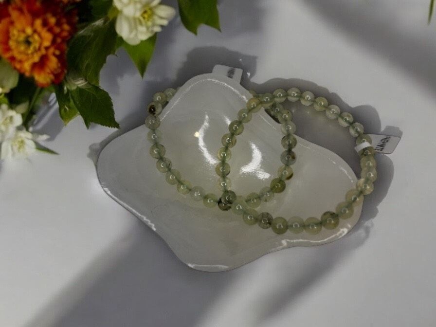 Dieses Prehnit-Armband mit 6 mm Kugeln strahlt eine sanfte, beruhigende Energie aus. Mit seinen zarten Grüntönen symbolisiert es innere Harmonie, Heilung und Schutz. Prehnit wird oft als Stein der Achtsamkeit und spirituellen Klarheit bezeichnet und unterstützt dabei, mit sich selbst und der Umwelt im Einklang zu sein.