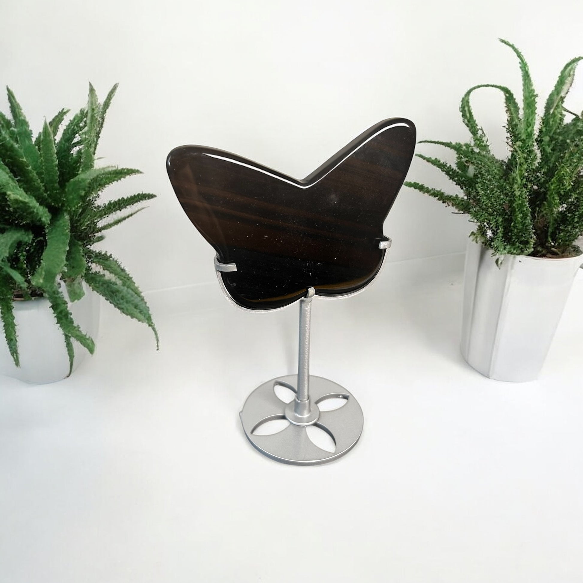 Dieser Schmetterling aus Midnight Lace Obsidian ist ein wahrer Blickfang. Der Kristall in den Maßen 9 × 5,5 cm zeigt die charakteristischen Bänderungen von tiefem Schwarz und schimmerndem Braun, die wie zarte Spitzenmuster wirken – daher auch der Name Midnight Lace.