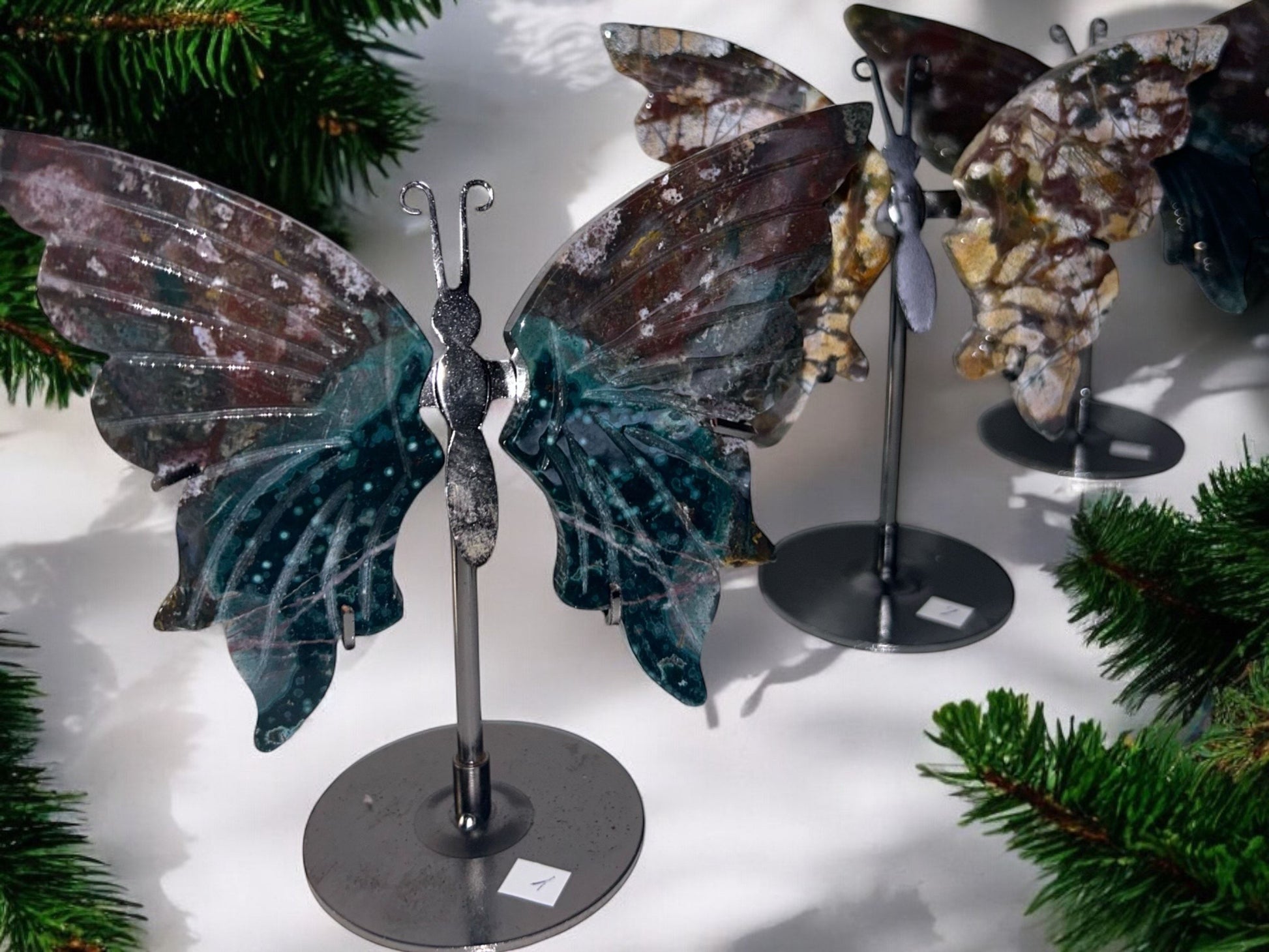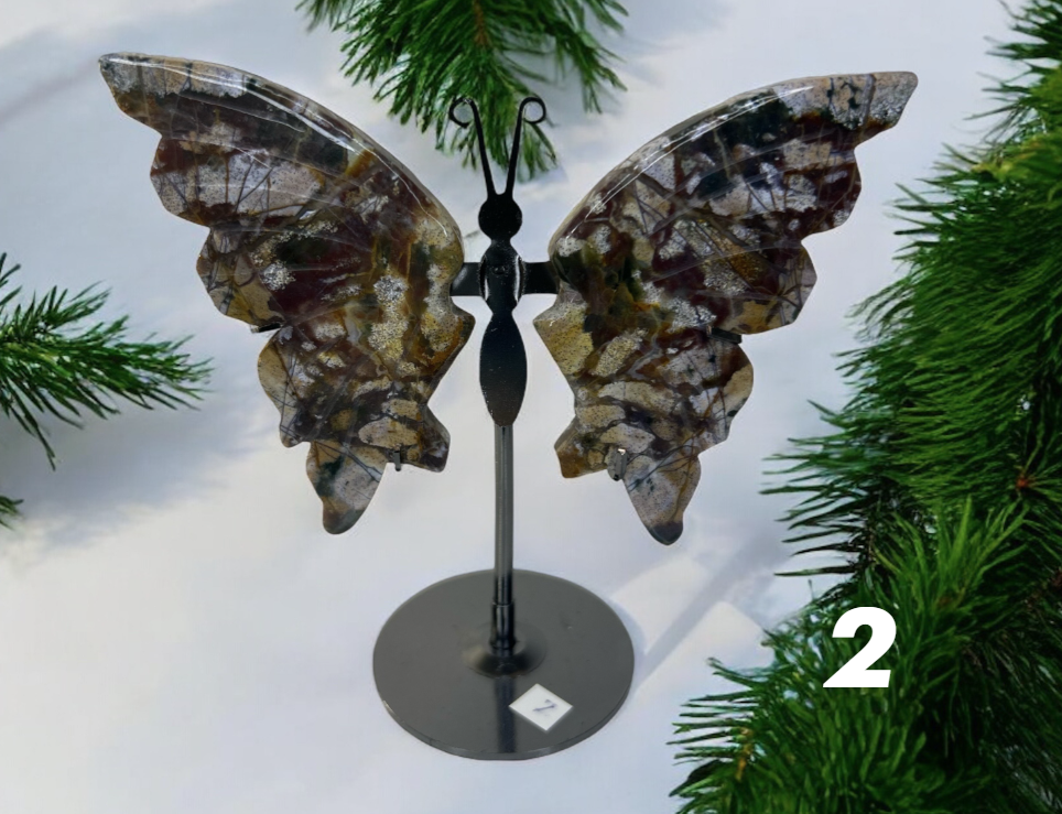 Der Ozean Jaspis ist bekannt für seine beruhigenden, erdigen Töne, die von sanften Blau- und Grüntönen bis hin zu warmen, braunen Akzenten reichen. Der Stein wurde kunstvoll in die Form eines Schmetterlings geschnitzt, ein Symbol für Transformation, Freiheit und Erneuerung. Diese besondere Form verleiht dem Stein zusätzlich eine tiefere spirituelle Bedeutung und macht ihn zu einem einzigartigen Talisman oder einem besonderen Dekorationsstück.