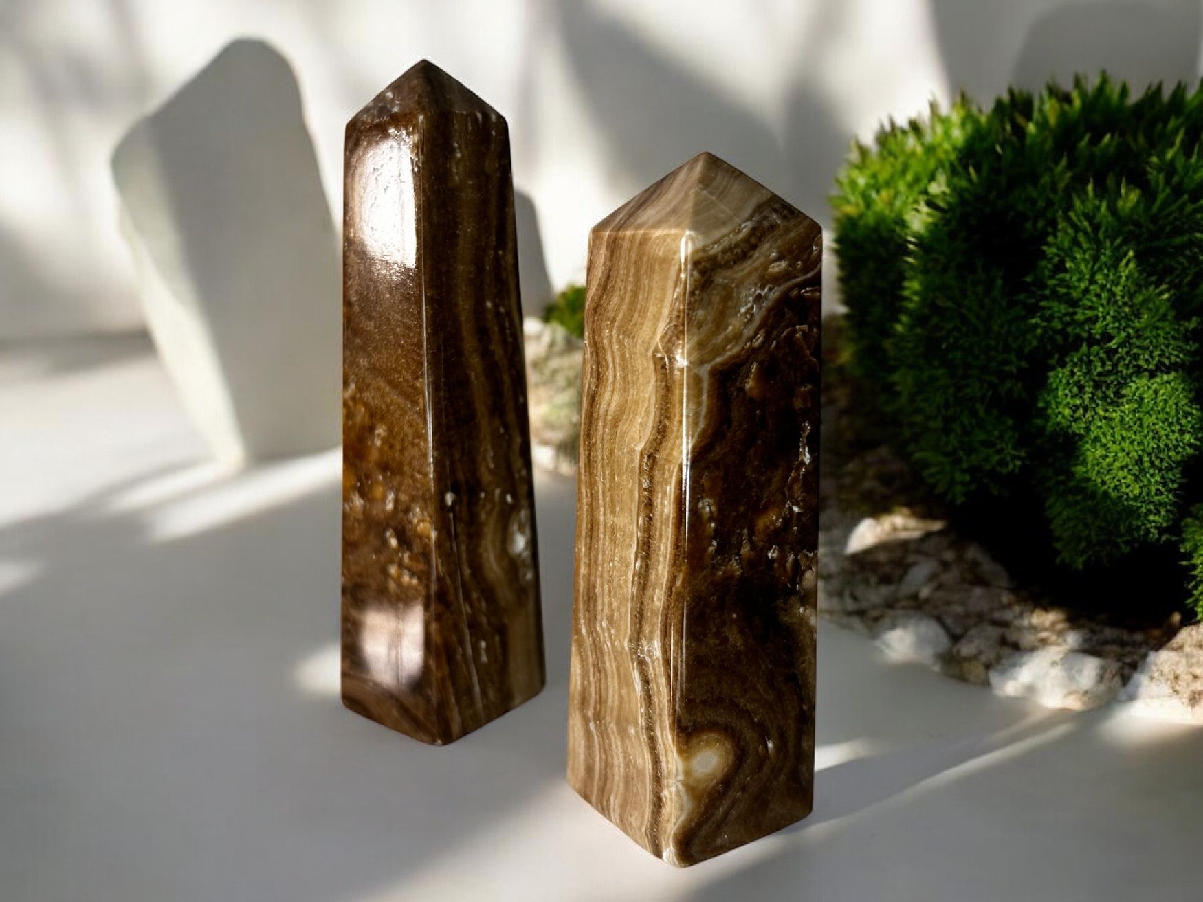 Diese Türme wurden sorgfältig aus hochwertigem Schokoladencalcit aus Pakistan gefertigt und bieten eine glatte, polierte Oberfläche, die die natürlichen Schattierungen und Muster des Steins perfekt zur Geltung bringt. Der Schokoladencalcit zeichnet sich durch seine sanften, schokoladenbraunen Töne aus, die ihm eine erdige und beruhigende Ausstrahlung verleihen.