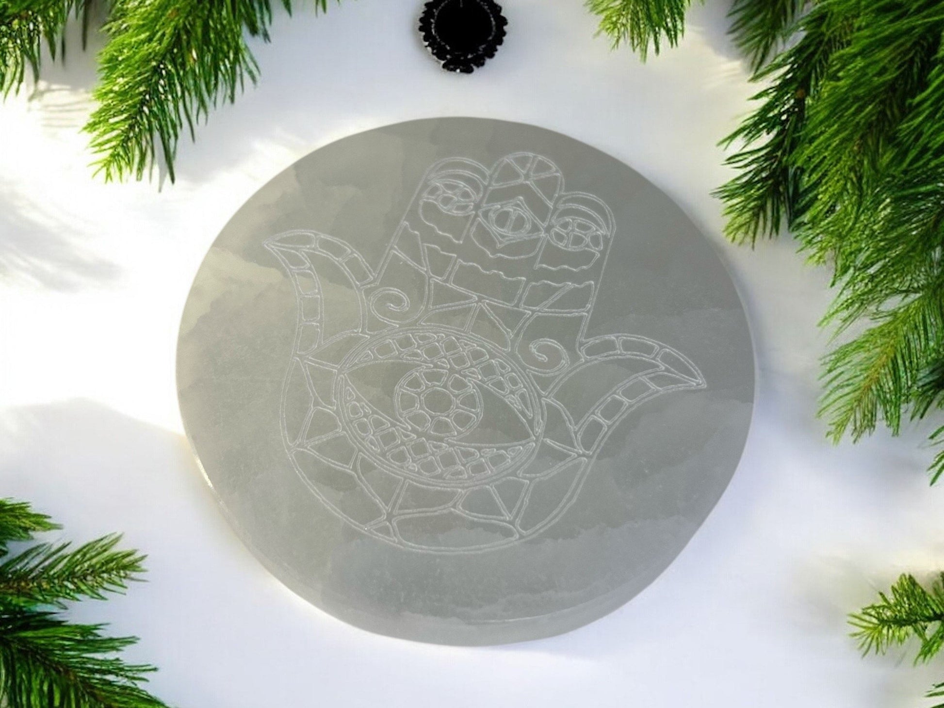Die Hand von Fatima, auch als Hamsa bekannt, wird auf der Ladeplatte kunstvoll eingraviert. Dieses Symbol ist ein universelles Zeichen für Schutz, Glück und Segen und verstärkt die spirituelle Wirkung des Selenits.